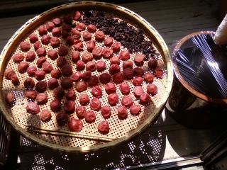 ロシアンティーは、ジャムと紅茶を混ぜたものと思っていましたが、違うんです。抹茶に菓子みたいに、ジャムをお茶請けにするのですって。3種類のジャム(バラ、木苺、ライム?のママレード)が別盛りになっていました↓。白いのは角砂糖です。うちでもやってみようかな。杏とイチゴと葡萄の自家製ジャムで。